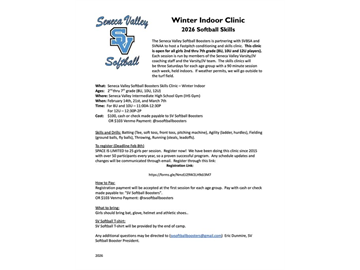 The Seneca Valley Softball Boosters, in partnership with SVBSA and SVNAA, invite your player to our Winter Fastpitch Conditioning & Skills Clinicβa proven program designed to sharpen skills and build confidence before the season!